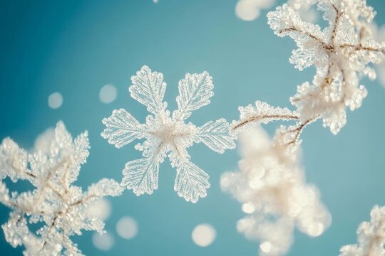 Soft falling snowflakes with bokeh glow on pale blue gradient winter backdrop