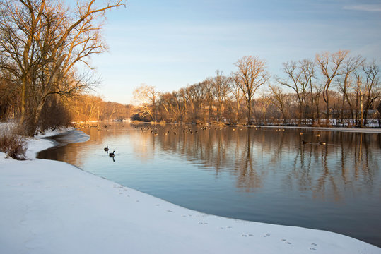 Canada geese drift quietly on placid stream on a winter morning.