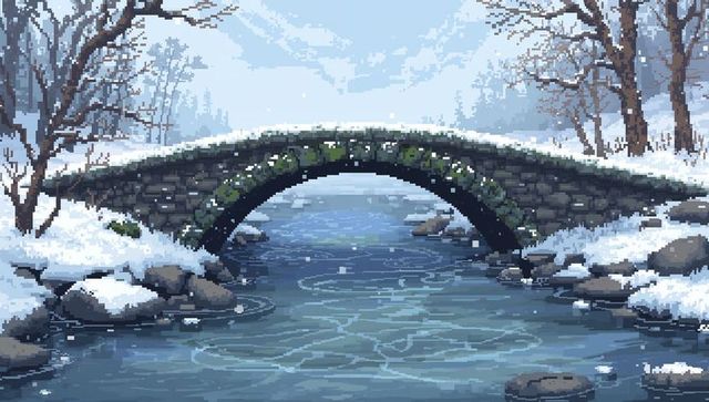 Snow-covered stone arch bridge over gently flowing winter stream pixel art