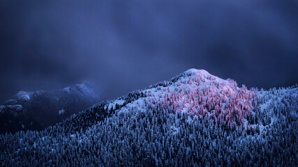 Majestic snow-covered mountain at sunset with pink light
