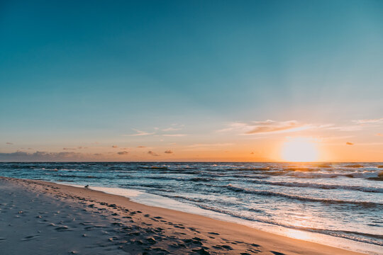 Pusta dzika Polska plaża, zachód słońca Ustka, Rowy, Poddąbie