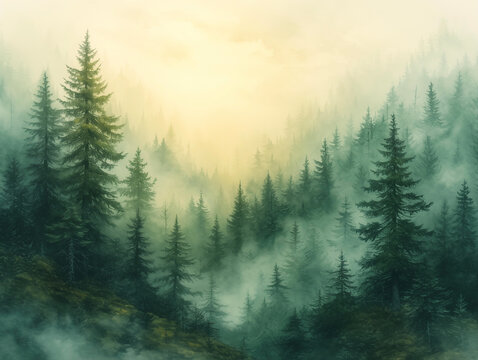 Wallpaper murals Coniferous forest in the fog, Mountains with fir trees and fog