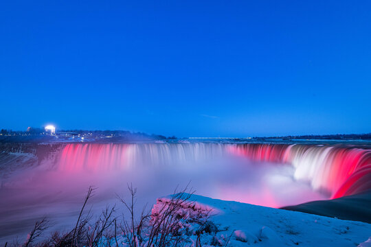 Niagara waterfall at night with vivid colors in winter