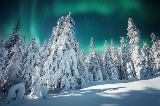 Aurora borealis over the frosty forest. Green northern lights above mountains. Night nature landscape with polar lights. Night winter landscape with aurora. Creative image. winter holiday concept.