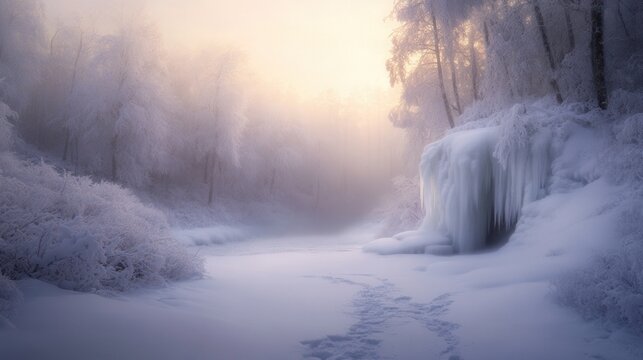 Majestic frozen wilderness with snowy trees and ice waterfall in tranquil winter sunset