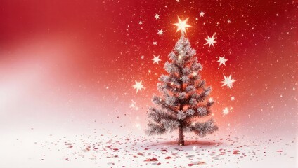 Sparkling Christmas Tree in a Snowy Landscape with Red Sky and Golden Stars.