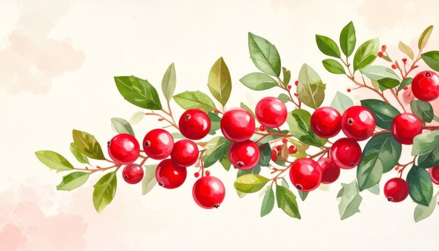 Watercolor illustration featuring a branch with red berries and green leaves on a light background.