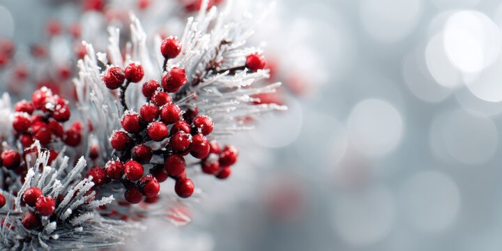 Close-up of holly branch with frosted leaves and bright red berries outdoors. Symbol of Christmas and New Year decoration