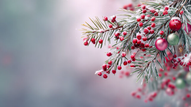 Frost-covered evergreen branches adorned with red berries and colorful festive ornaments set against a soft, blurred winter background with gentle snowfall