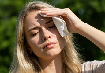 Woman wiping sweat from her forehead with a textured cloth in warm lighting