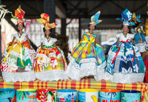 Poupées noires en tenue martiniquaise typique, tissus madras, sur une étagère dans un marché couvert