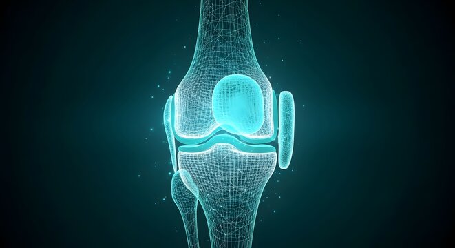 Orthopedic Medical Anatomy of a Human Knee Joint in Glowing Digital Wireframe Style