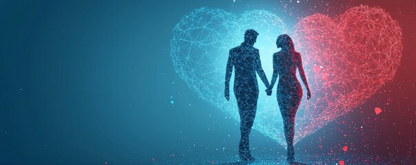 Illustration of wireframe couple holding hands with heart shapes in background