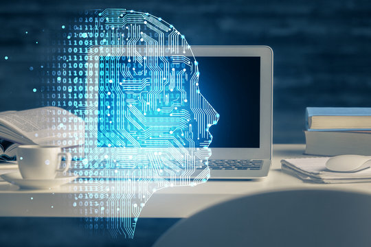 Double exposure of work space with computer and human brain drawing hologram. Brainstorm concept.