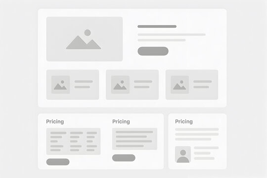 Grayscale pricing page wireframe layout with image blocks, feature list grids, call-to-action buttons, and clean structure for website UI design preview and prototyping mockup
