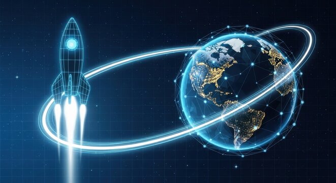 Futuristic neon wireframe satellite in space with glowing geometric design