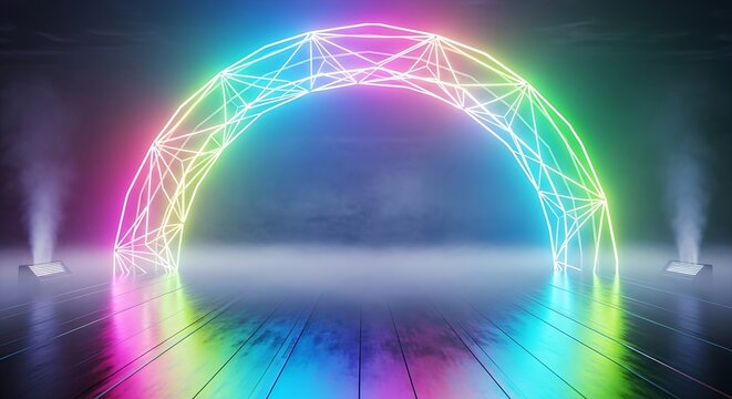 Futuristic Architectural Wireframe Structure in Dark Interior with Neon Light Pillars