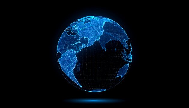 digital wireframe globe with north and south america continents connected by glowing network of dots lines on dark background