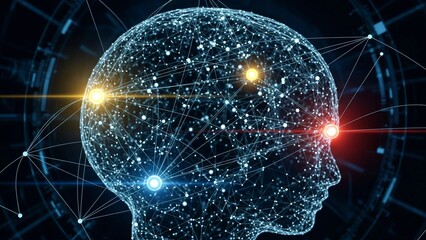 A futuristic side profile of a human head constructed from an intricate, glowing network of lines and nodes, symbolizing artificial intelligence and a digital brain.