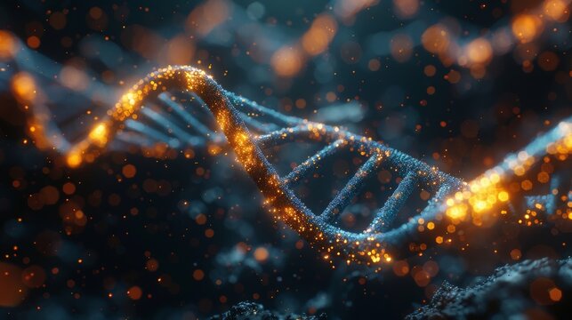 DNA double helix with glowing particles on dark.