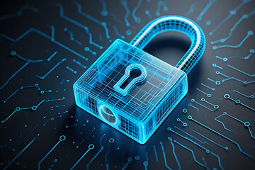 3d wireframe padlock on virtual grid in high-tech digital environment