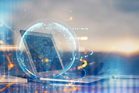 Multi exposure of table with computer and world map hologram. International data network concept.