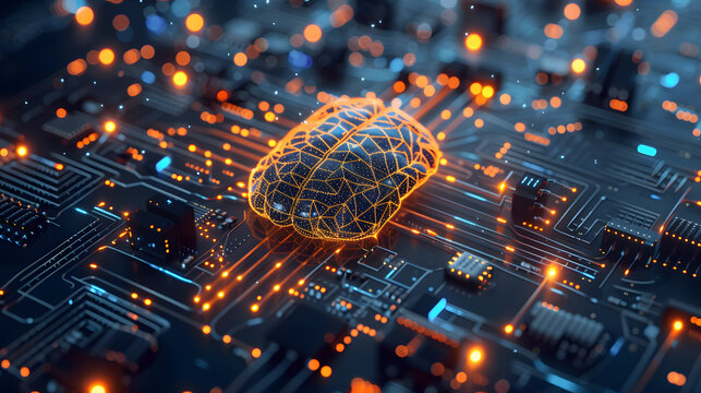Machine learning , artificial intelligence, ai, deep learning blockchain neural network concept. Brain made with shining wireframe above cpu on circuit