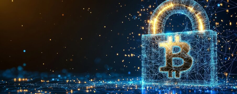 Digital illustration of secure Bitcoin padlock with wireframe design