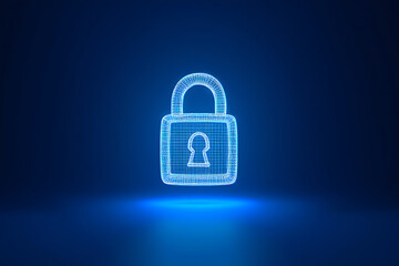 Abstract Digital Security Padlock with Glowing Particles and Technology Grid