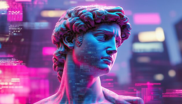 Vaporwave Retrofuturistic Sculpture: Surreal Bust Of David Featuring Digital Glitched Elements And Bright Neon Colors