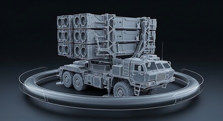 Futuristic luminous digital model of a heavy industrial dump truck showing engineering and mechanics