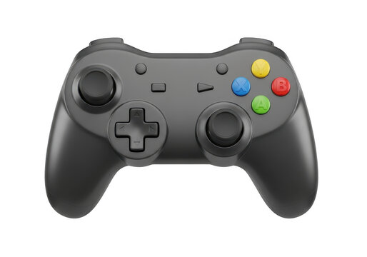 Black gaming console controller with colored buttons on device