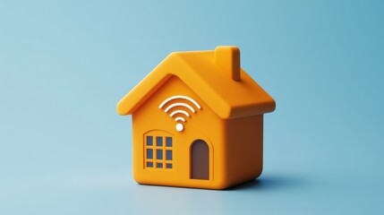 Orange house model with a wireless symbol on blue background, representing smart home technology and internet connectivity.