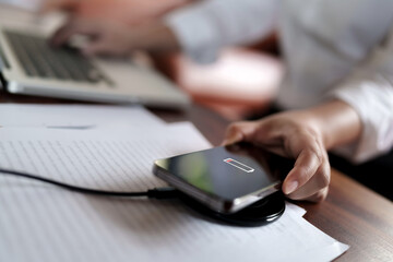 Woman charging mobile phone with wireless fast charger pad on desktop.