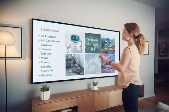 Young woman controlling temperature in the living room with smart phone and digital touch screen panel. Concept of heating control in a smart home