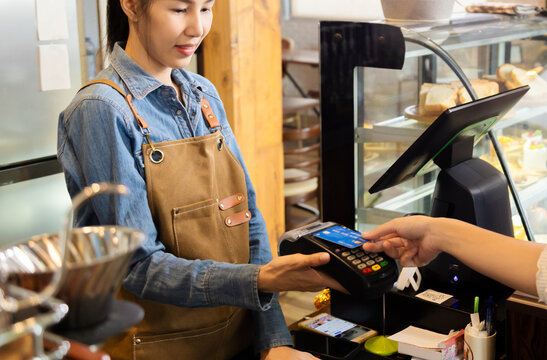 Asian traveler paying contactless with mobile phone in street food night market. Mobile payment concept