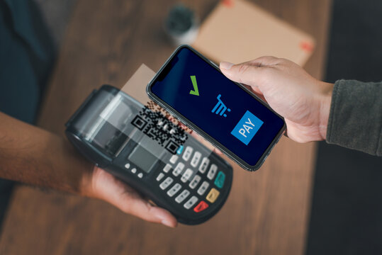 Close-up of a hand holding a smartphone completing a payment transaction at a point of sale terminal..