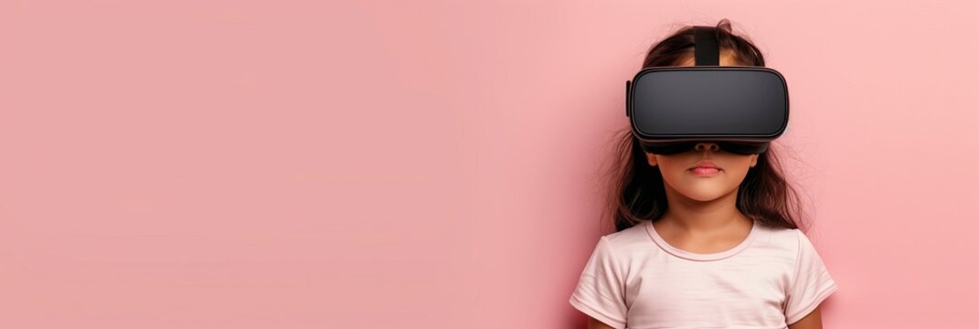 Hispanic Kid Girl Wearing VR Headset, Isolated on Right. Enjoying Virtual Reality Experience on Pink Background with Studio Lighting. Horizontal Large Photo Banner with Empty Copy Space