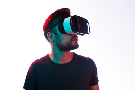 Close up portrait of handsome man playing video games in goggles or 3d glasses, wearing virtual reality headset for smart phone on his head, smiling, holding remote control in his hand