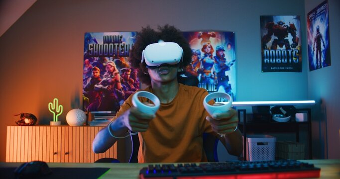 Teenage gamer in VR headset plays virtual online video game using wireless controllers. African American guy having fun in leisure time in his room. Gaming at home. View from PC screen perspective.