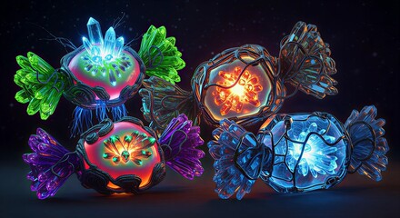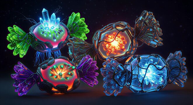 Candy shaped objects made of glowing crystal elements and intricate wirework on a dark background. Abstract digital art illustration for mystical theme.