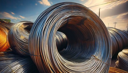 Stunning photo of metal wire coils stacked in the metalworking industry for annealing and wire drawing processes.
