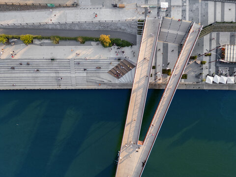 pedestrian bridge over blue Vistula river, people walking at shore and embankment, Warsaw, aerial top view