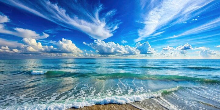 Clear turquoise water and wispy clouds over a tranquil ocean during midday