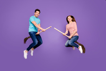 Full body photo of crazy two people guy lady jumping high sitting on witch brooms going theme party couple wear casual blue striped shirts jeans shoes isolated purple color background