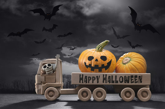 Halloween. In wooden toy car, funny pumpkins, in cabin skeleton. Gloomy background with bats.