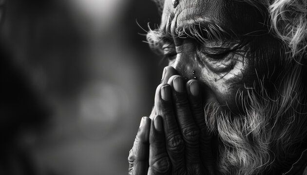 Closeup of old man in praying black and withe