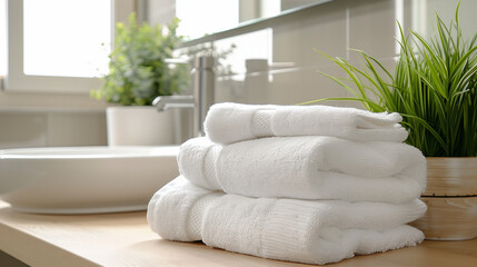 A stack of white towels in a modern bathroom, adding a bold and stylish touch to the sleek
