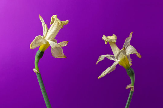 Two beautiful dried flowers opposite each other. Love in old age concept. Yellowed daffodils on purple background. Withered narcissus.