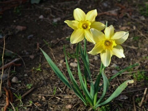 two yellow daffodils blooming among last year's withered grass in a spring park, the first garden flowers growing in a flower bed on the ground covered with dry grass, yellow daffodils close-up